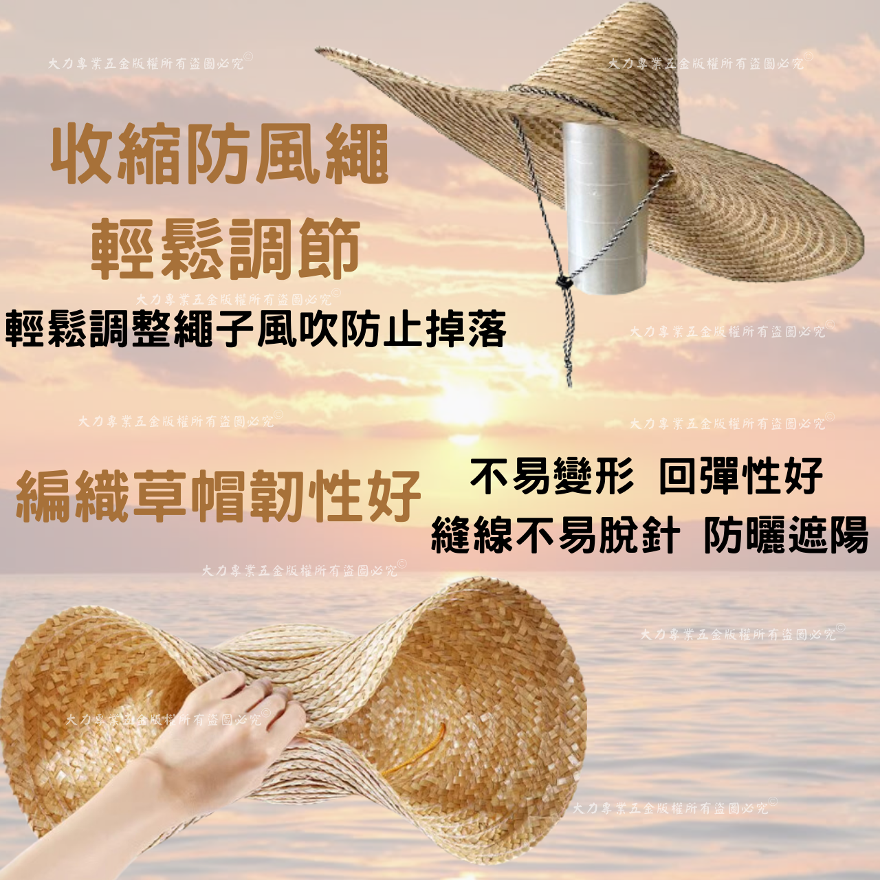 產品特色:編織草帽韌性好 / 不易變形 / 回彈性好 / 縫線不易脫針 / 收縮防風繩輕鬆調節 /